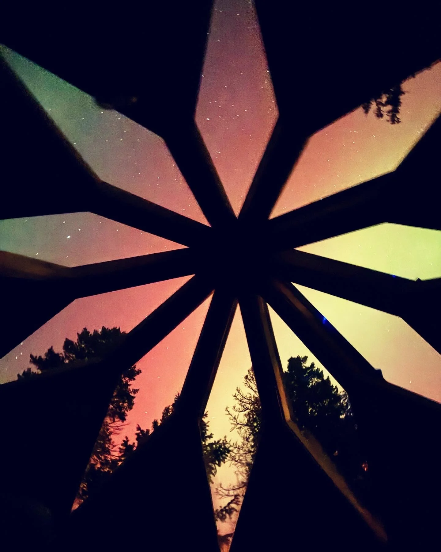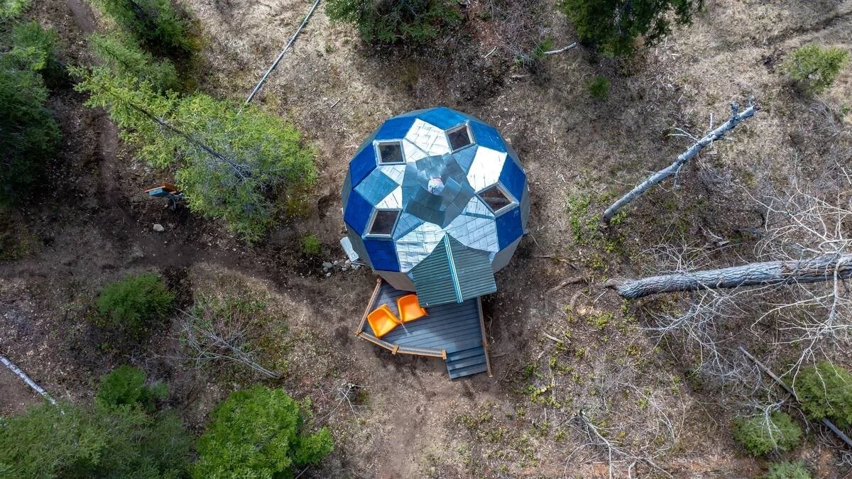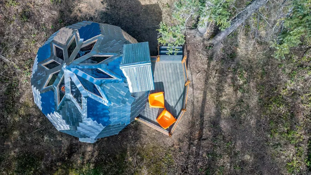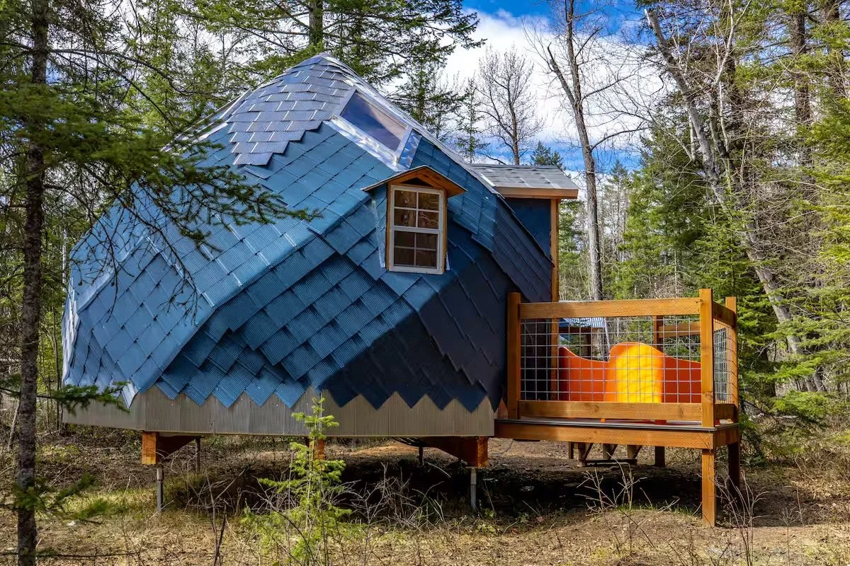 Zonohedron-shaped cabin where every face is centrally symmetric and intentionally built from local cottonwood, blue spruce and birch