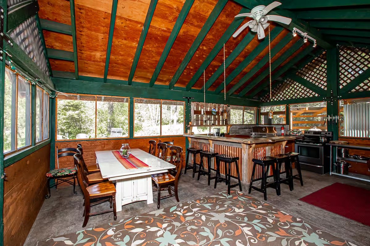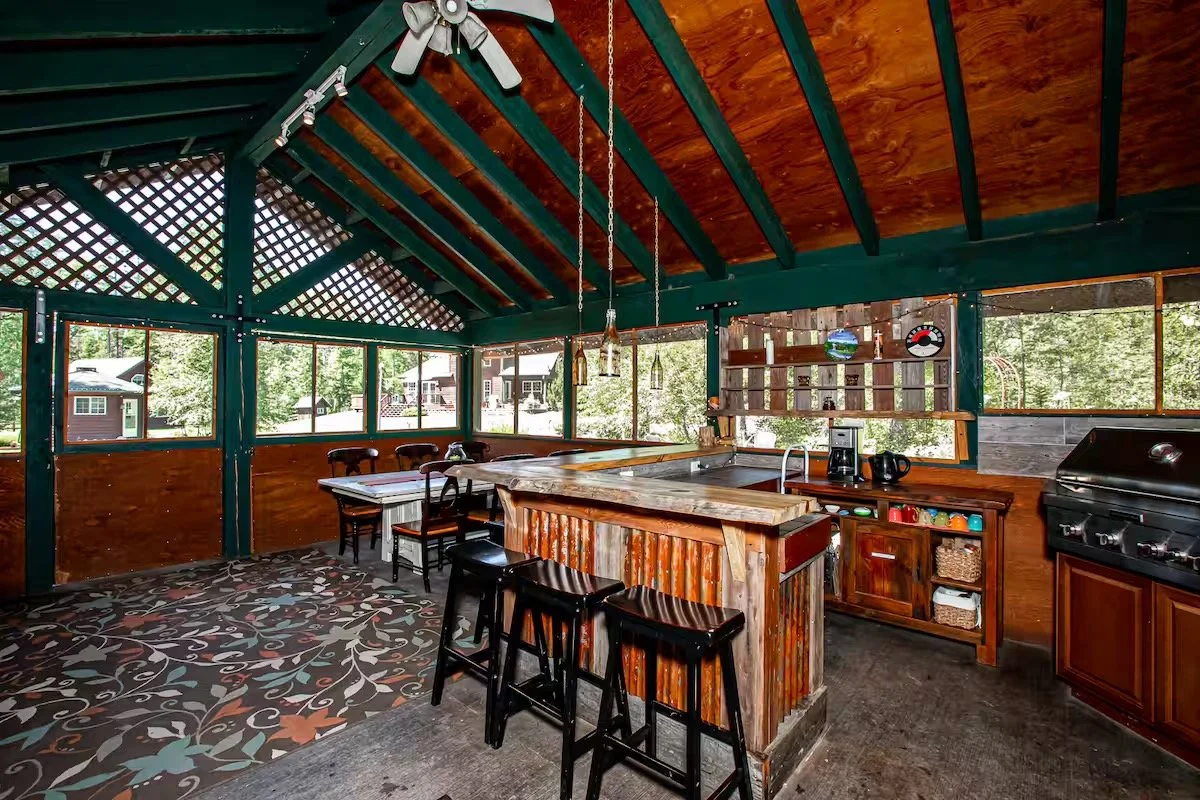 400 sq. ft. outdoor kitchen with bar and farmhouse-style dining table